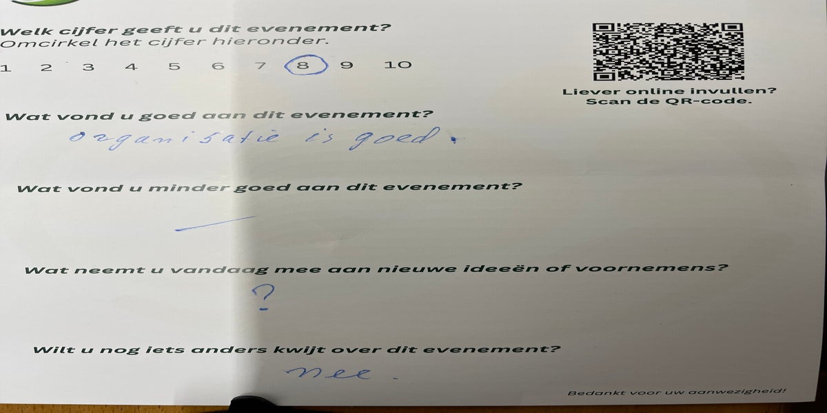 We vroegen onze bezoekers over wat ze aan het evenement goed vonden, minder goed, wat ze heeft geïnspireerd en wat ze verder nog graag wilden delen. We zijn heel blij met de reacties die ons erg zullen helpen in de voorbereiding van mogelijk vervolg op dit evenement. Houd de berichten in de gaten!